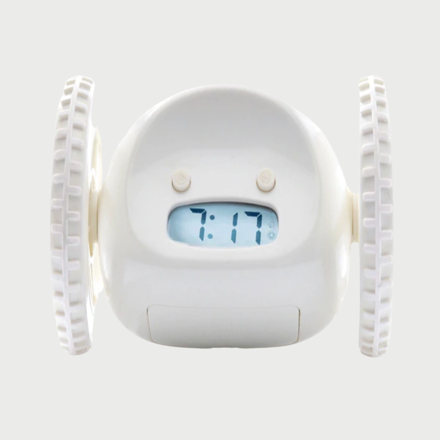This fun little clock is a great gift for kids to get them interested in learning the time and having fun at the same time. No more clicking the snooze button! Clocky is the durable alarm clock that runs away beeping, to get you out of bed. If you click snooze Clocky will run around beeping at you until you make it out of bed. It runs away beeping on carpet or wood, jumps from 3 feet high, is loud R2D2-like robotic sound, gives you the option to snooze once or disable snooze and to turn off wheels / have roll away feature.