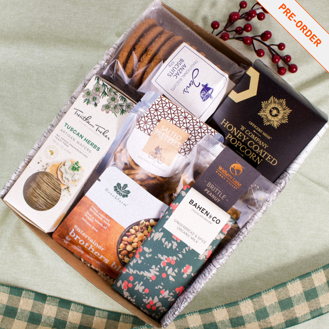 Inside, you’ll find classic Anzac biscuits and crunchy honey-coated popcorn for a touch of nostalgia, balanced by the warm, spiced sweetness of gingerbread and spice milk chocolate. For those who lean towards savoury, salted pretzels and artisan herb wafers bring plenty of flavour and crunch, while the roasted Entertainer’s Blend adds a wholesome, satisfying snack option. A generous slab of peanut brittle rounds out the selection with its signature snap and sweetness - a treat that’s hard to resist.