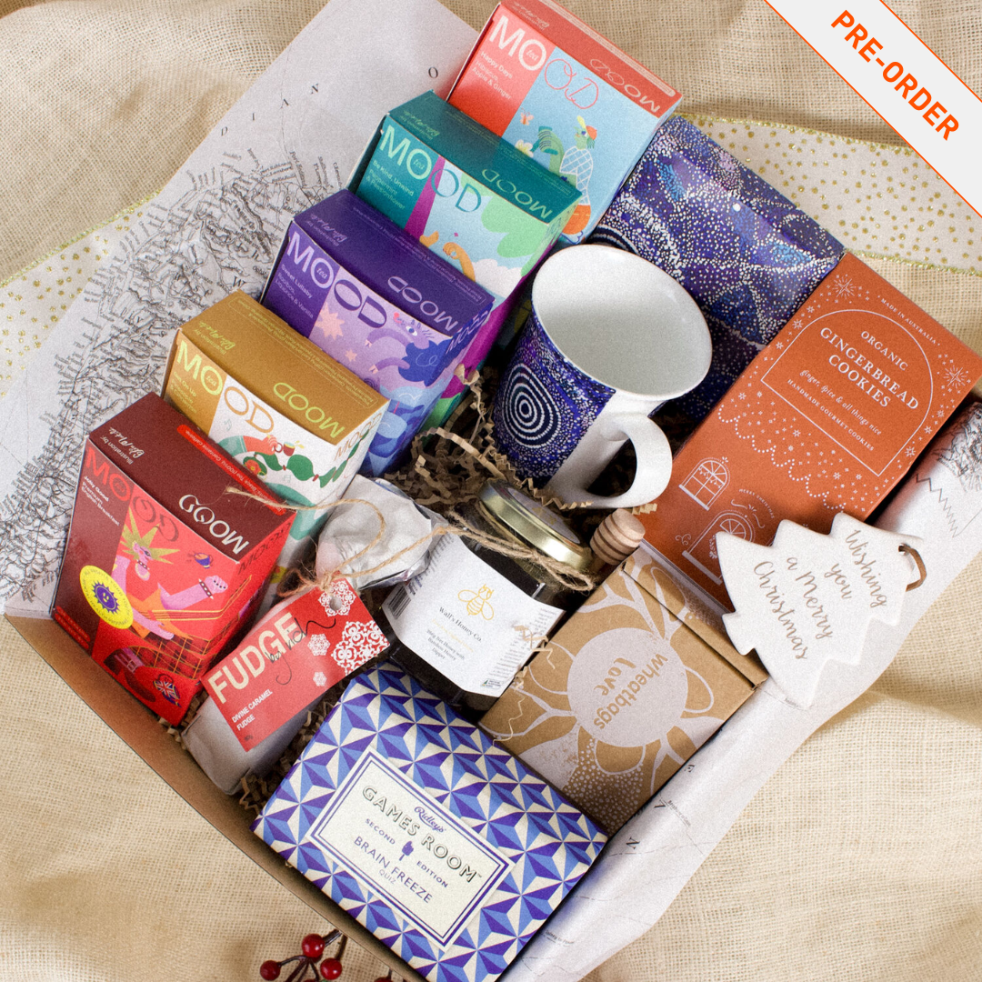 Inside, you’ll find a calming blend of thoughtful items, a soothing lavender heat pillow, pure honey with a bamboo twirler, a beautifully designed Indigenous artwork mug, the fun and fast-paced Brain Freeze card game, indulgent caramel fudge, and our festive organic gingerbread cookies made with wholesome Australian ingredients.