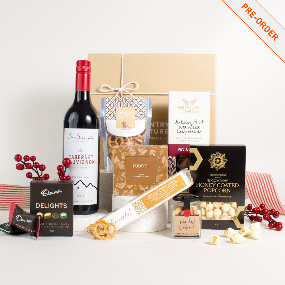 Inside, you’ll find artisan fig and olive crispbreads that pair beautifully with cheeses or antipasti, alongside roasted cashews and salted pretzels for the ideal savoury crunch. On the sweeter side, Australian honey nougat, milk and dark chocolates, and crunchy peanut brittle offer a variety of textures and richness. Honey-coated popcorn adds a playful touch, and a bottle of Sam Miranda Cabernet Sauvignon brings depth and warmth to every bite it accompanies.