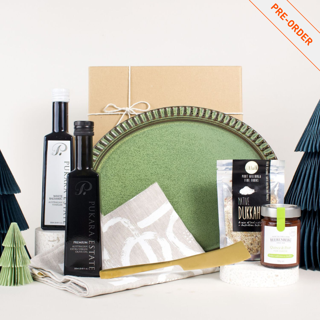At its heart is a striking green oval platter by Robert Gordon, perfect for festive grazing or elegant table settings. Premium olive oil and white balsamic vinegar from regional Australia offer depth and brightness to any dish, while a spoonful of native dukkah or a dollop of quince and pear paste elevates even the simplest cheese board. A hand-printed linen tea towel brings texture and beauty to the kitchen, completing the gift with a practical yet luxurious touch.