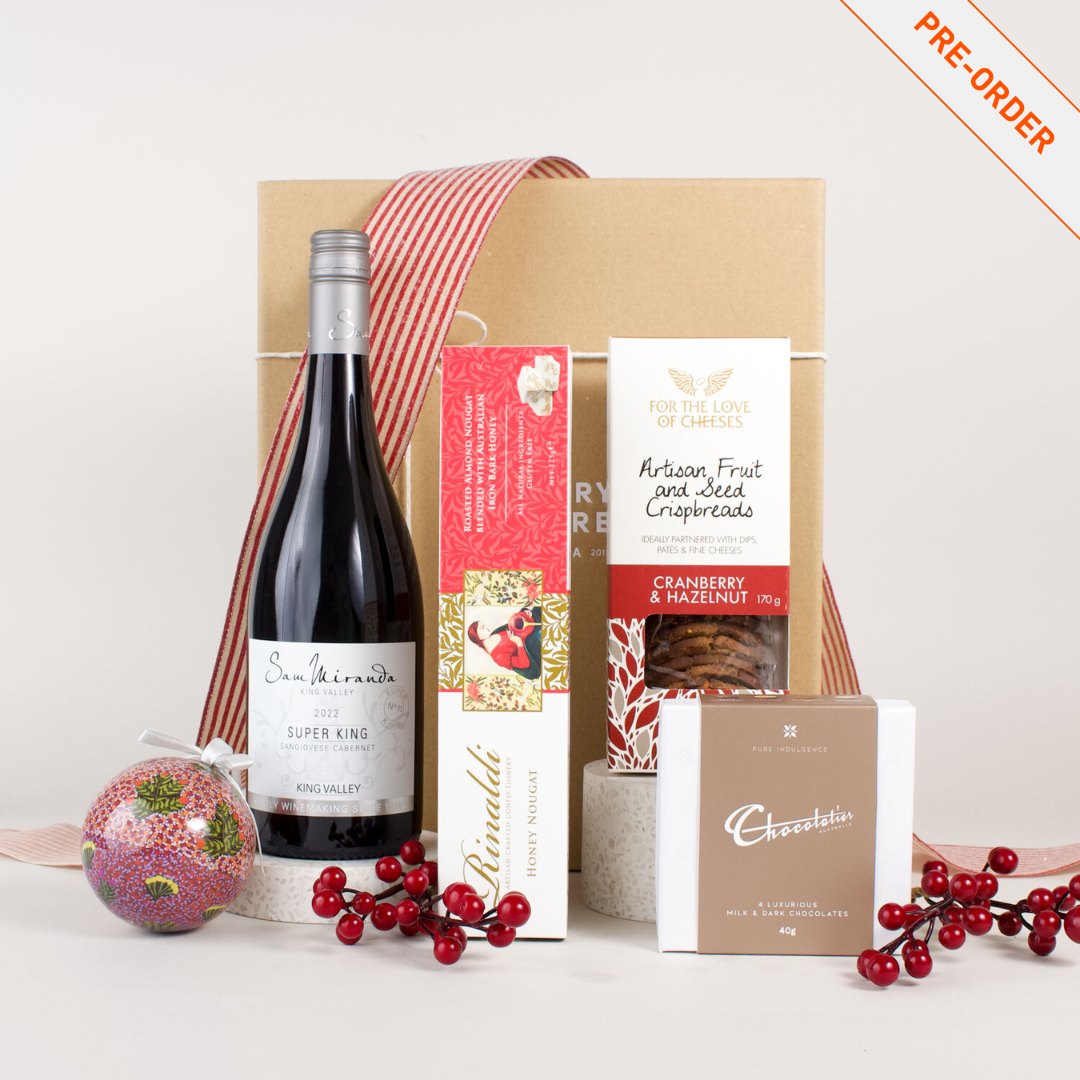 Inside, you’ll find a vibrant bottle of Sam Miranda’s Super King red, full-bodied and made for festive toasting, alongside a beautifully rich nougat sweetened with Australian iron bark honey. Artisan crispbreads offer a delicious base for cheeses or grazing platters, while a selection of milk and dark chocolates brings indulgent holiday sweetness. A hand-painted Indigenous artwork Christmas bauble adds a thoughtful, lasting keepsake to mark the moment.
