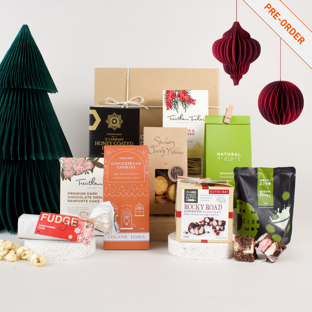 Inside, you’ll find a mix of sweet and savoury delights to suit all tastes, from buttery caramel fudge and fluffy rocky road to rich chocolate panforte and spiced gingerbread cookies. For savoury moments, there are smoky cheese nibbles, crisp poppyseed and sesame seed crackers, and briny green olives, all perfect for casual grazing or festive platters. Natural macadamias and honey-coated popcorn add a satisfying crunch, rounding out a gift that’s made for sharing.