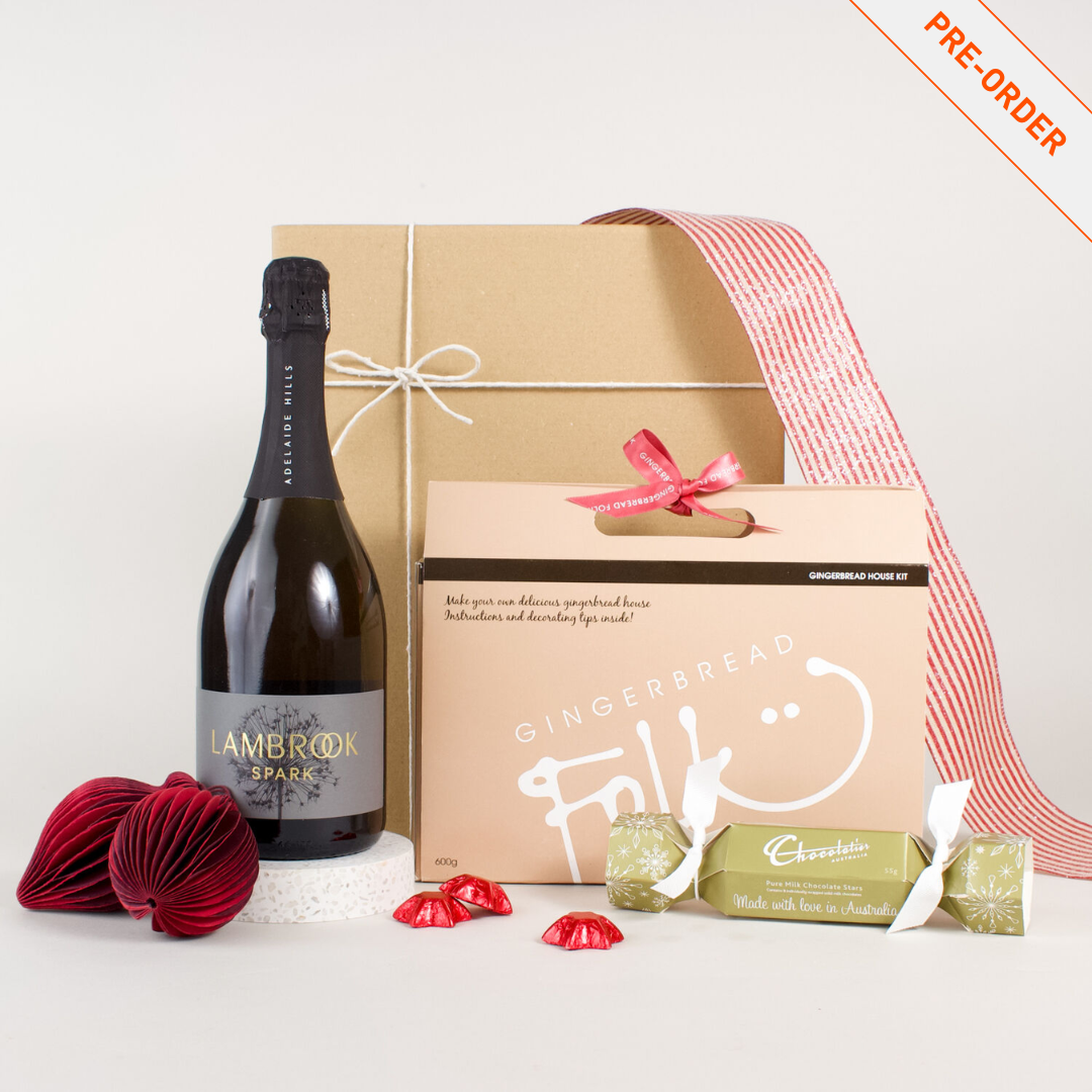 Pop the top on Lambrook’s ‘Spark’ Sparkling Pinot Noir—a vibrant, effervescent drop that sets the tone for festive cheer—then dive into Chocolatier’s smooth Pure Milk Chocolate Stars for a sweet indulgence. The real centrepiece? A charming Gingerbread House Kit by Folk, ready to be built and decorated, making for a fun and delicious holiday activity. Light-hearted, delicious, and full of sparkle, the Holiday Fun Hamper is Christmas joy in a box.
