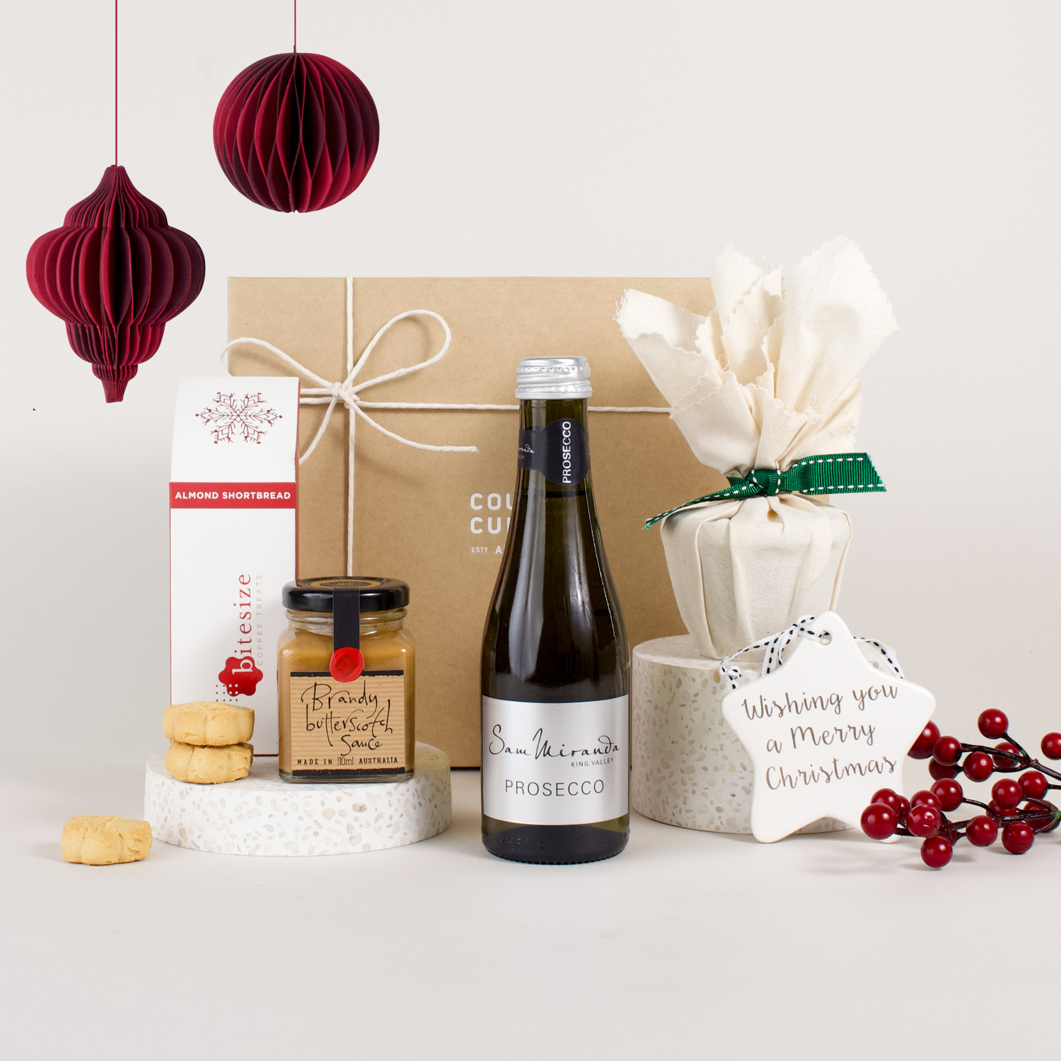 Inside, you’ll find a traditional plum pudding that’s beautifully dense and bursting with fruity flavour, ready to be enjoyed after a long Christmas lunch. To accompany it, there’s a deliciously smooth brandy butterscotch sauce, the perfect finishing touch to elevate every spoonful. We’ve also included a crunchy gourmet almond shortbread, adding a buttery, nutty contrast to the rich pudding. To raise a glass to the occasion, a King Valley Prosecco piccolo brings a refreshing sparkle, perfectly sized for toasting. Finally, a charming ceramic star ornament with a warm Christmas message is included to add a festive touch to any home.