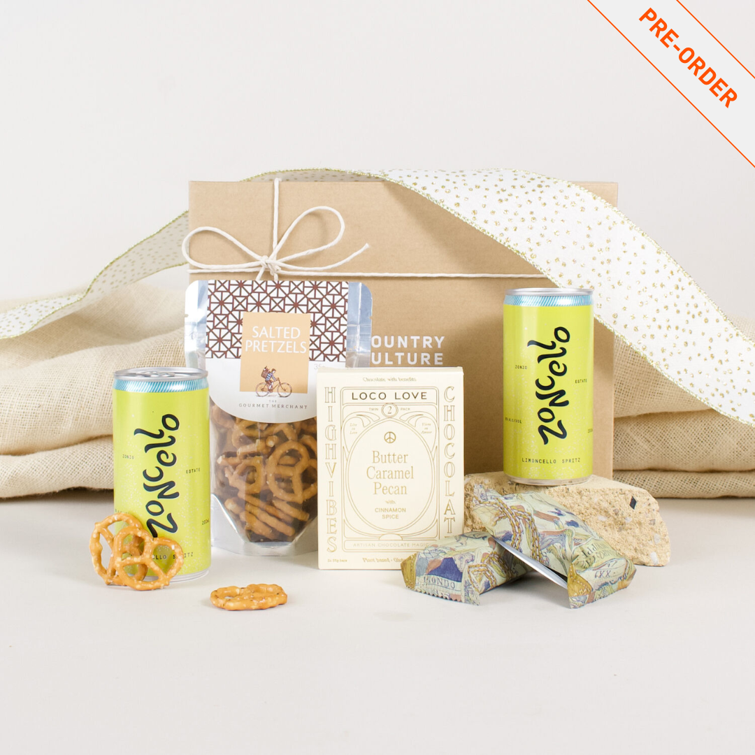 Inside, you’ll find two refreshing cans of Zoncello Limoncello Spritz from Zonzo Estate, offering a crisp, citrusy sparkle that’s perfect for cooling down. Complementing these are rich pecan butter caramel chocolates from Loco Love, creamy, nutty, and utterly indulgent. To balance the sweetness, a pack of crunchy salted pretzels adds the perfect savoury crunch, making every bite and sip a little escape from the everyday.