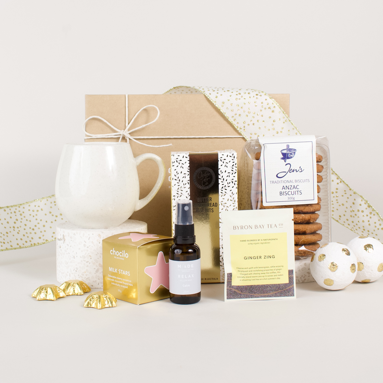 Inside, a handcrafted Hug Me Mug by Robert Gordon sets the tone for mindful sipping, paired beautifully with a soothing ginger tea satchel. To enhance the moment, a soft spritz of relaxing lavender pillow mist adds a calming touch to the air, creating the ideal setting for rest and recharge. Sweet treats complete the experience, think buttery shortbread biscuits, classic Anzac cookies, and smooth milk chocolate stars for a little festive indulgence.