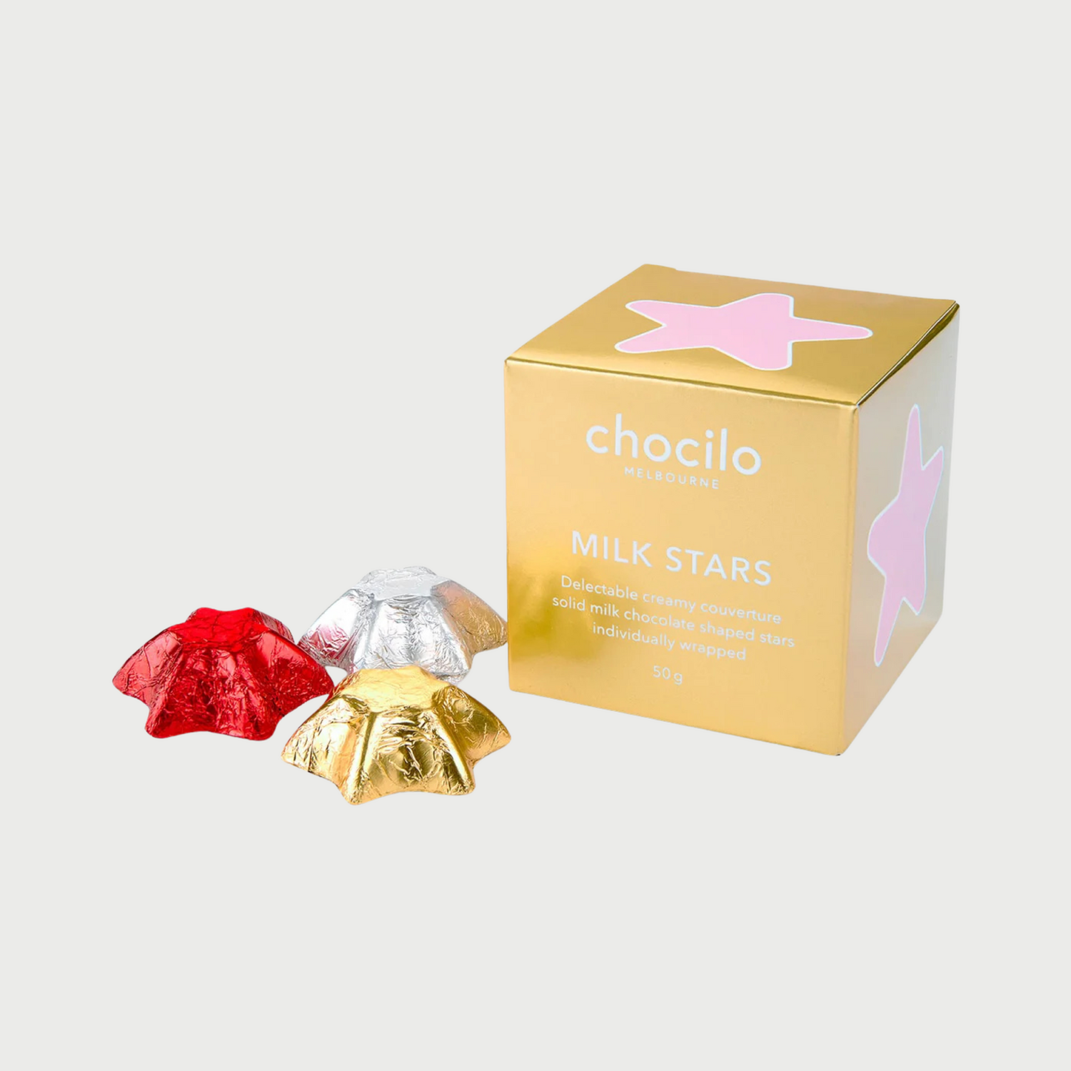From our collection of popular gift cubes, this delightful chocolate gift box features 8 festive, assorted coloured foiled solid milk chocolate stars. Packaged in a delightful stocking-stuffer-sized box by Melbourne chocolatier Chocilo.