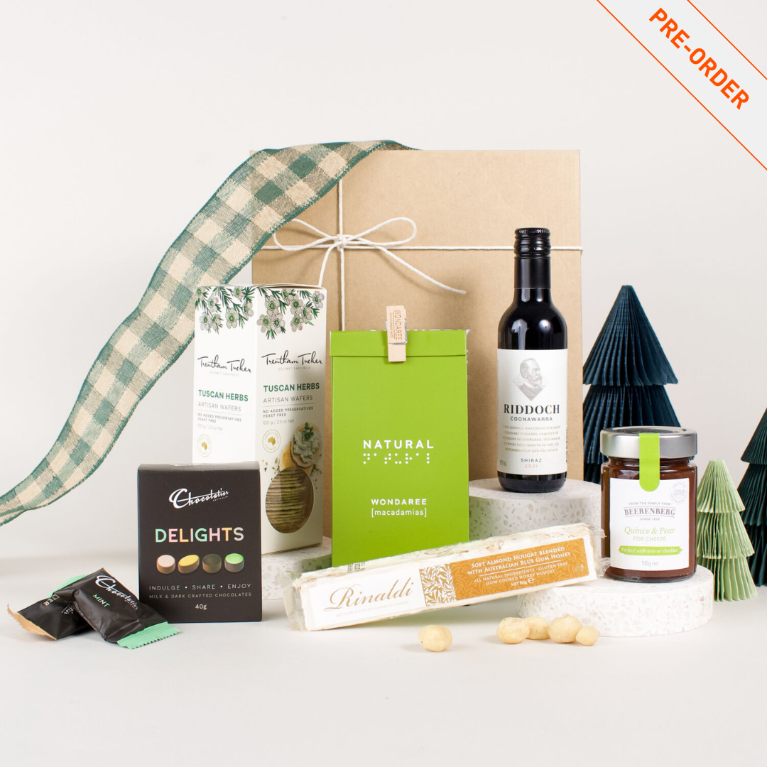 Inside, a rich and smooth Coonawarra Shiraz from Riddoch sets the tone, offering bold, velvety notes that pair perfectly with a decadent milk and dark chocolate gift box. Complementing these are crunchy natural macadamias and a sweet Australian blue gum honey nougat, both offering layers of flavour and texture. To enhance any cheese platter, a jar of quince and pear preserves adds a fruity, tangy balance, while artisan Tuscan herb wafers provide a crisp, savoury finish.