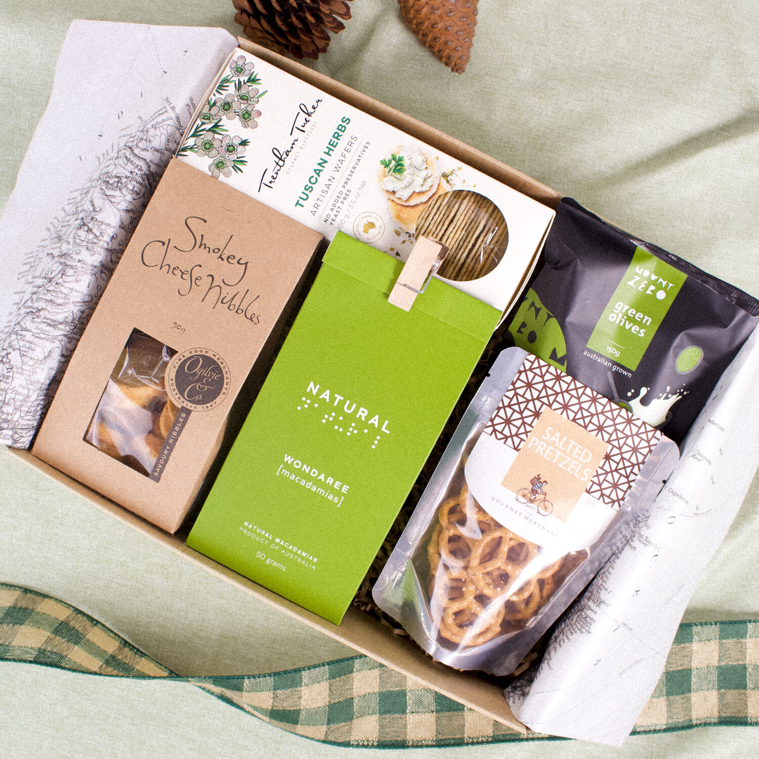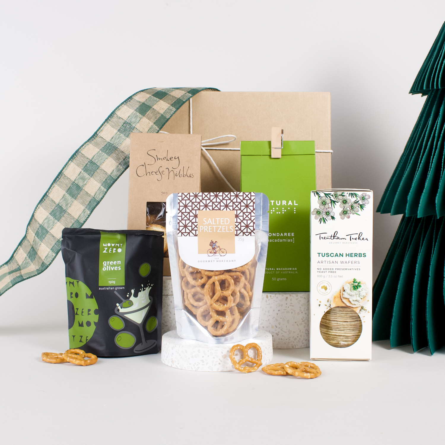 Inside, you’ll find the satisfying crunch of salted pretzels, paired beautifully with buttery natural macadamias for a classic holiday treat. Smokey cheese nibbles add a rich depth of flavour, while briny green olives bring a deliciously moreish bite. To complete the spread, we’ve included crisp artisan crackers infused with Tuscan herbs - perfect for pairing or enjoying on their own.