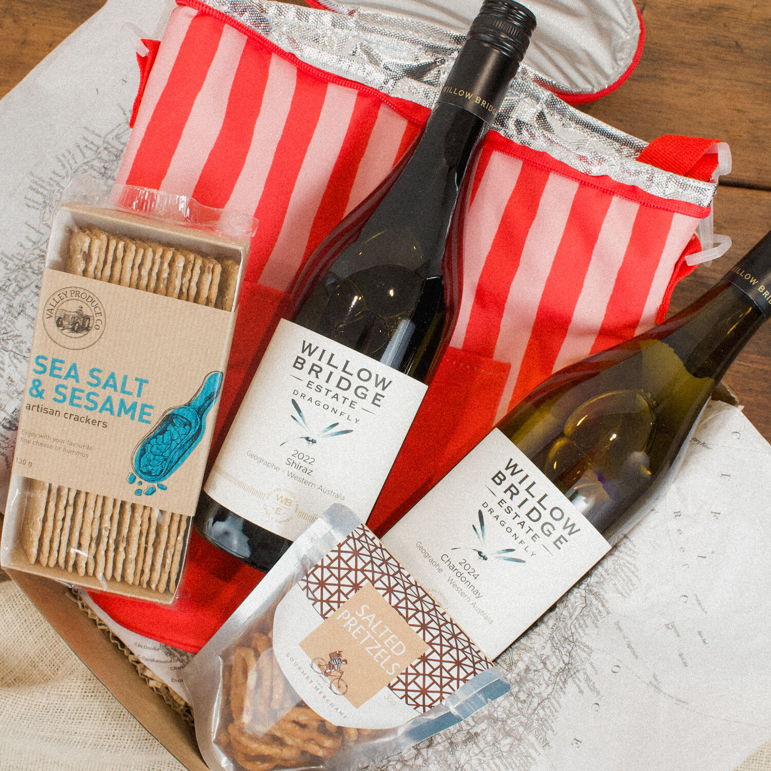 Inside, you’ll find two crisp and approachable wines—Dragonfly Shiraz and Chardonnay—perfectly paired with crunchy salted pretzels and artisanal sea salt and sesame crackers. All of this comes beautifully packed in a vibrant striped red barrel cooler bag, making it easy to carry and keep chilled on the go. The Picnic & Pour Hamper is an effortless way to elevate any outdoor occasion with flavour and fun.