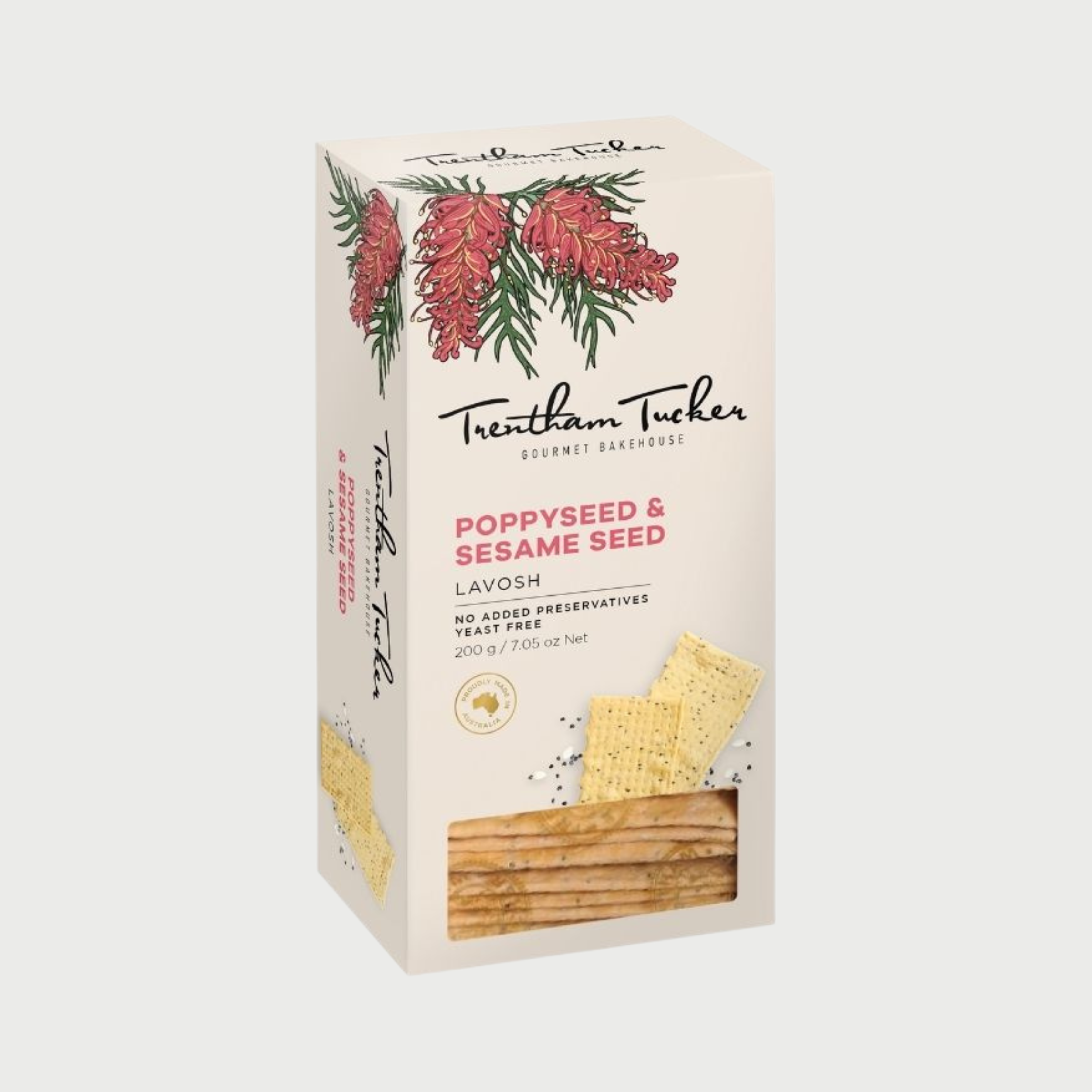 Elevate your gourmet offerings with Trentham Tuckers Lavosh Poppyseed & Sesame Seed Gift Box. Handcrafted in Australia, these artisan lavosh crackers blend the nutty crunch of poppy and sesame seeds with a delicate, crisp texture, creating a versatile companion for cheeses, dips, or enjoyed on their own. Presented in an elegant gift box, they make a thoughtful addition to any occasion, from festive gatherings to everyday indulgence.