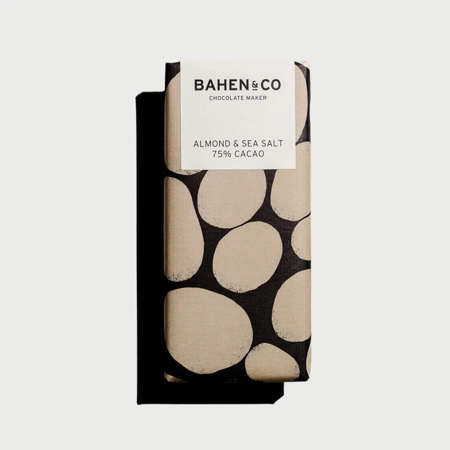 Bahen & Co Almond & Sea Salt Chocolate blends the finest of almonds, slow roasted with farm-grown olive oil. Finished with hand-harvested sea salt. The chocolate factory operates on the owners family farm in Margaret River, WA. The beans are sourced from a volcanic valley on the wild isles of Papua New Guinea. And we also love the gorgeous designer patterned wrap!