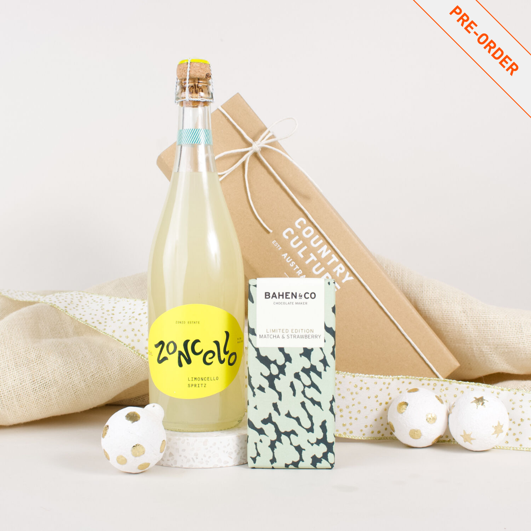 Inside, you’ll find a crisp and citrusy Zoncello Limoncello Spritz from the Yarra Valley that instantly lifts the spirits. Paired alongside is a luscious matcha and strawberry milk chocolate from Bahen & Co., bringing a delicate balance of creamy sweetness and subtle earthiness. Together, these thoughtfully selected treats create a sensory experience that feels like a refreshing escape, ideal for relaxing afternoons or celebratory toasts.