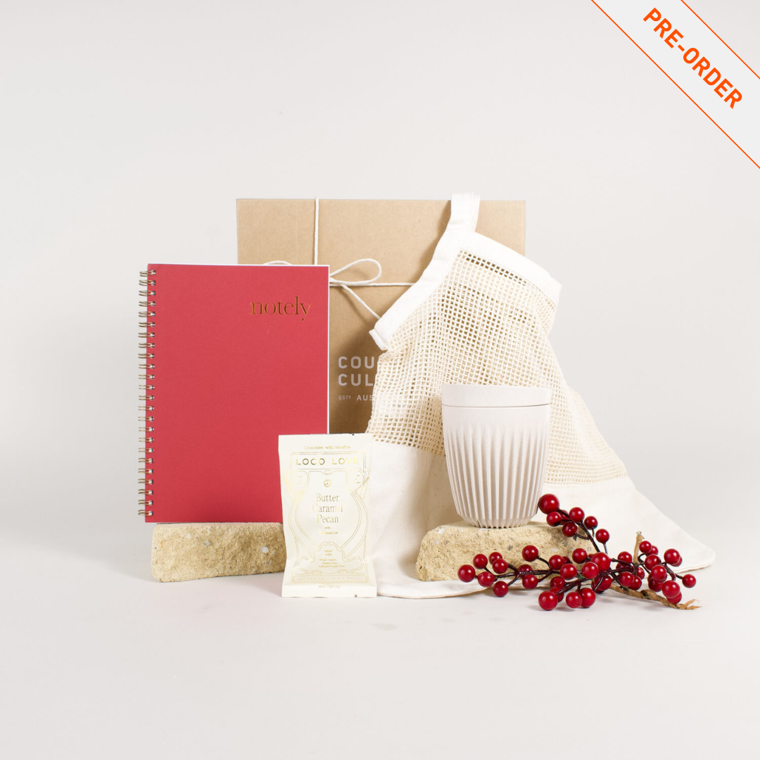 Inside, you’ll find a beautifully crafted wine and copper spiral notebook, perfect for jotting down ideas or daily reflections. A reusable coffee husk cup offers a stylish and eco-conscious way to enjoy favourite hot drinks on the go, while a durable organic cotton tote bag makes sustainable shopping both practical and chic. To sweeten the experience, we’ve included luscious pecan butter caramel chocolate from Loco Love - a guilt-free treat that delights the taste buds.