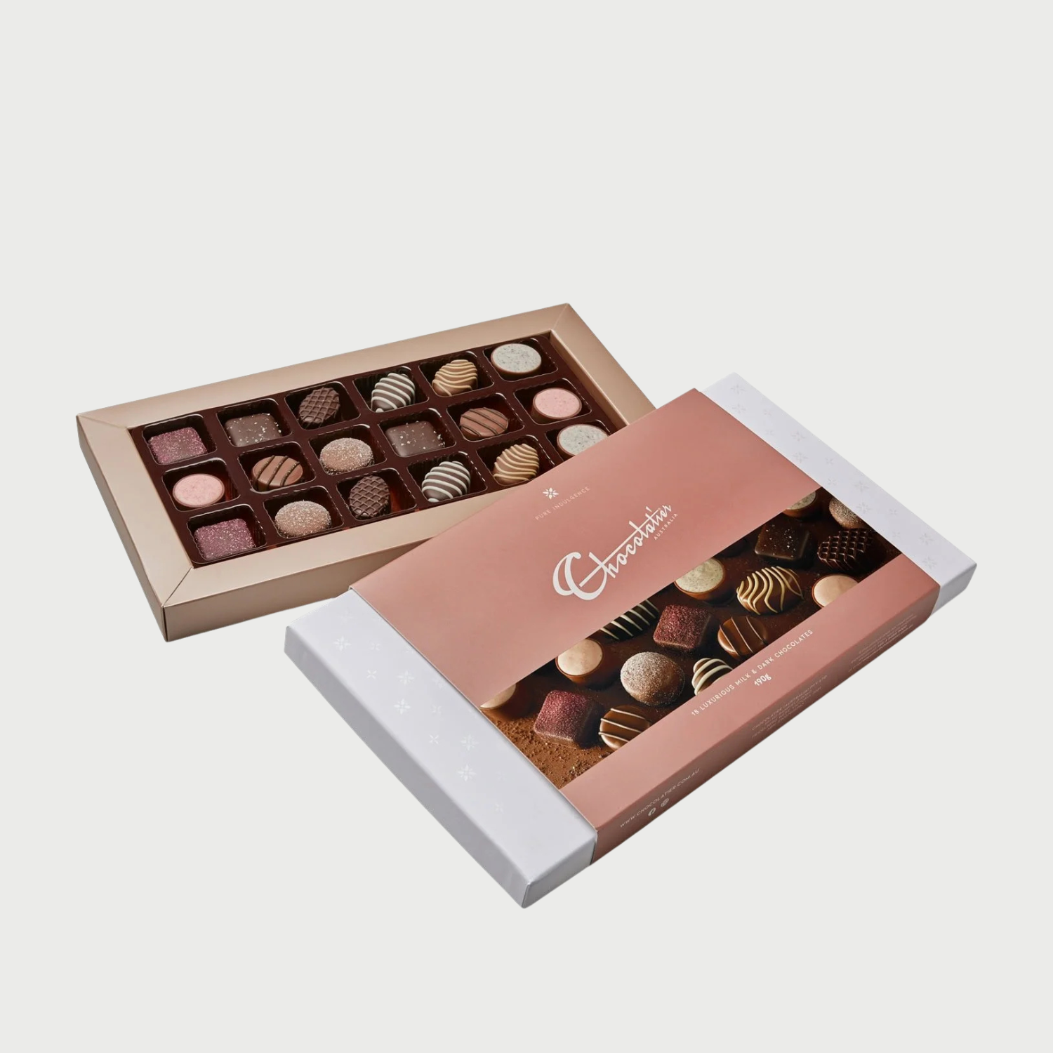 Perfect to share! This box features a selection of 4 luxurious milk and dark chocolates made with love in Melbourne. Contains a Butterscotch Cup, Cookies and cream, Baby Cappuccino, and Dark Salted Caramel chocolates.