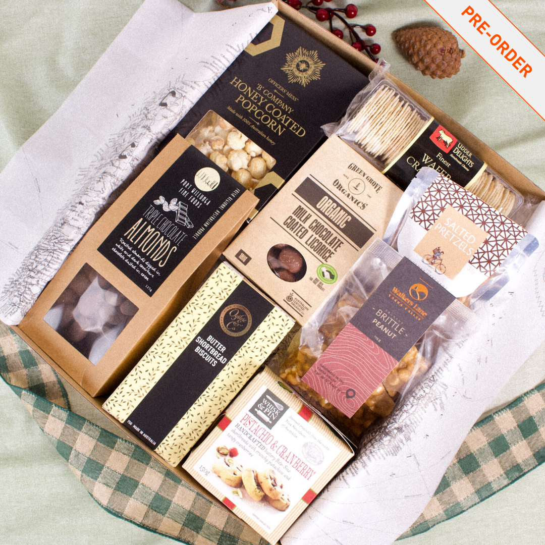 Inside, you’ll find a festive feast of textures and flavours to please every palate. Buttery shortbread comes in both classic and cranberry pistachio varieties - delicate, crumbly, and perfect with a cup of tea or coffee. Crisp salted pretzels and golden honey-coated popcorn offer that irresistible savoury crunch, while the creamy milk chocolate-coated licorice and decadent triple chocolate almonds bring a rich, indulgent sweetness. A slab of nostalgic peanut brittle delivers the perfect snap and just the right balance of salty-sweet, and the artisan-style wafer crackers tie it all together, ideal for cheese boards or casual snacking.