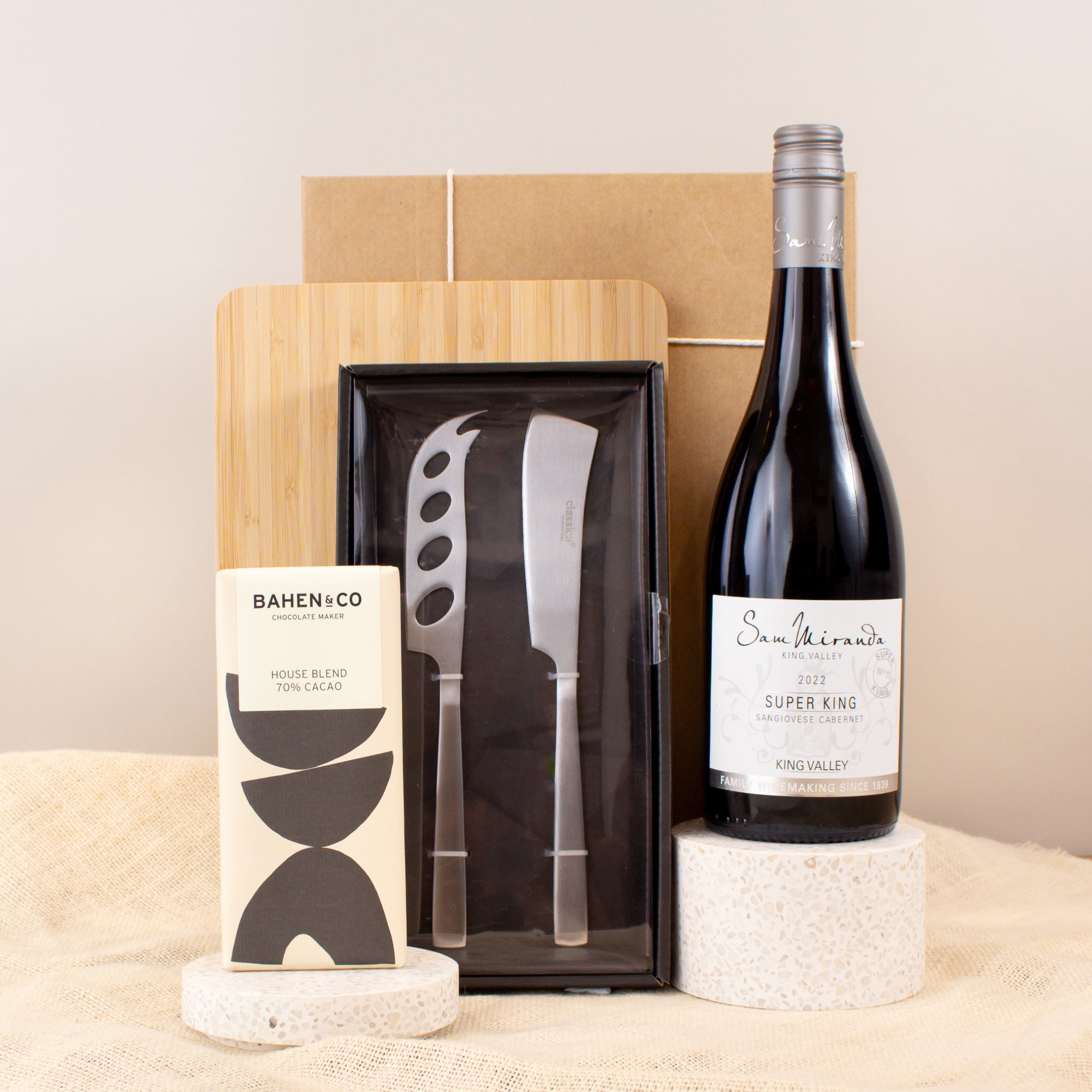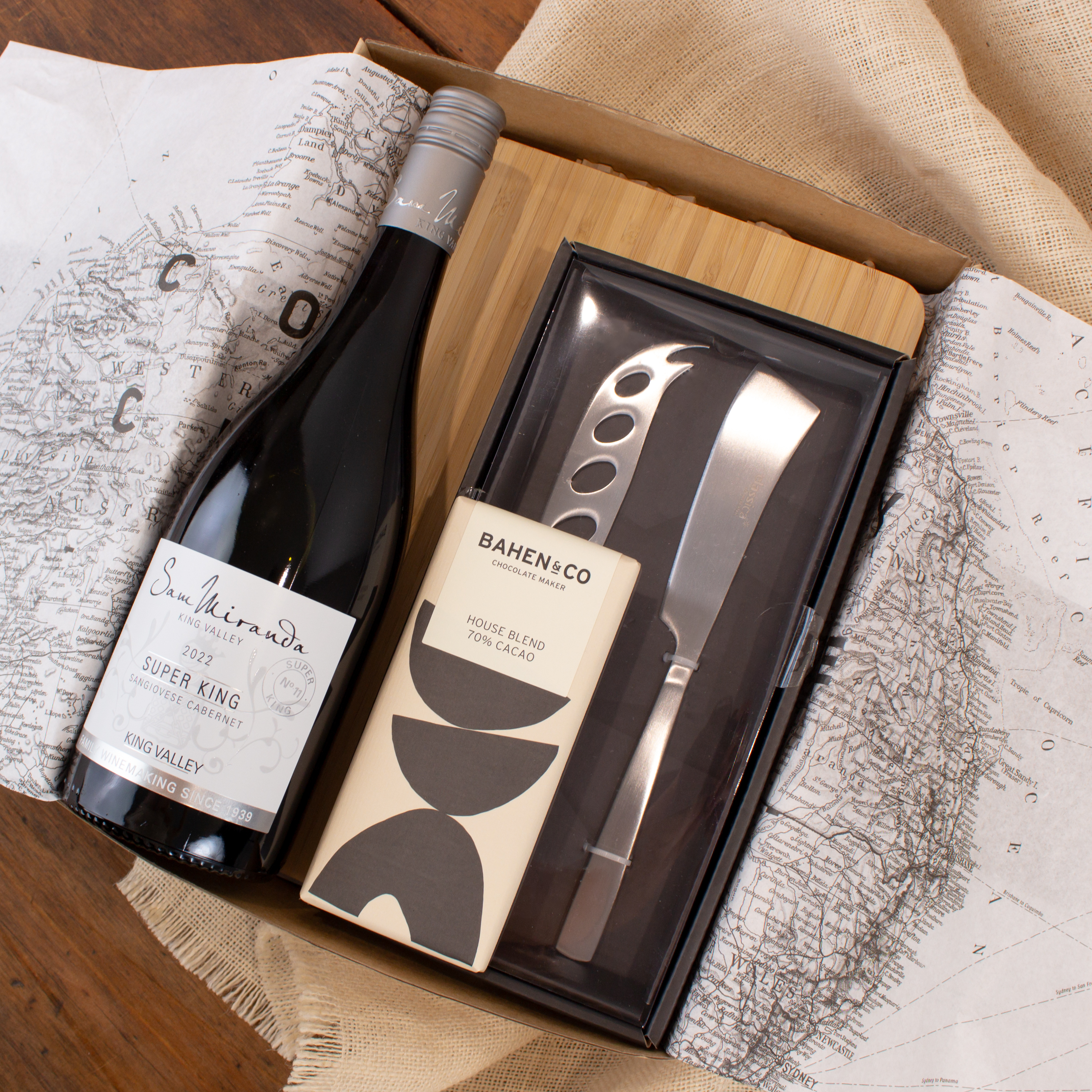 Inside, you'll find the renowned Super King Sangiovese Cabernet from Sam Miranda King Valley wines, alongside one of our favourite chocolates from Australian chocolatiers at Bahen & Co in Melbourne. As keepsakes that will remind the recipient of your thoughtful intentions for years to come, you'll find a high-quality bamboo board and a set of classy silver cheese knives.